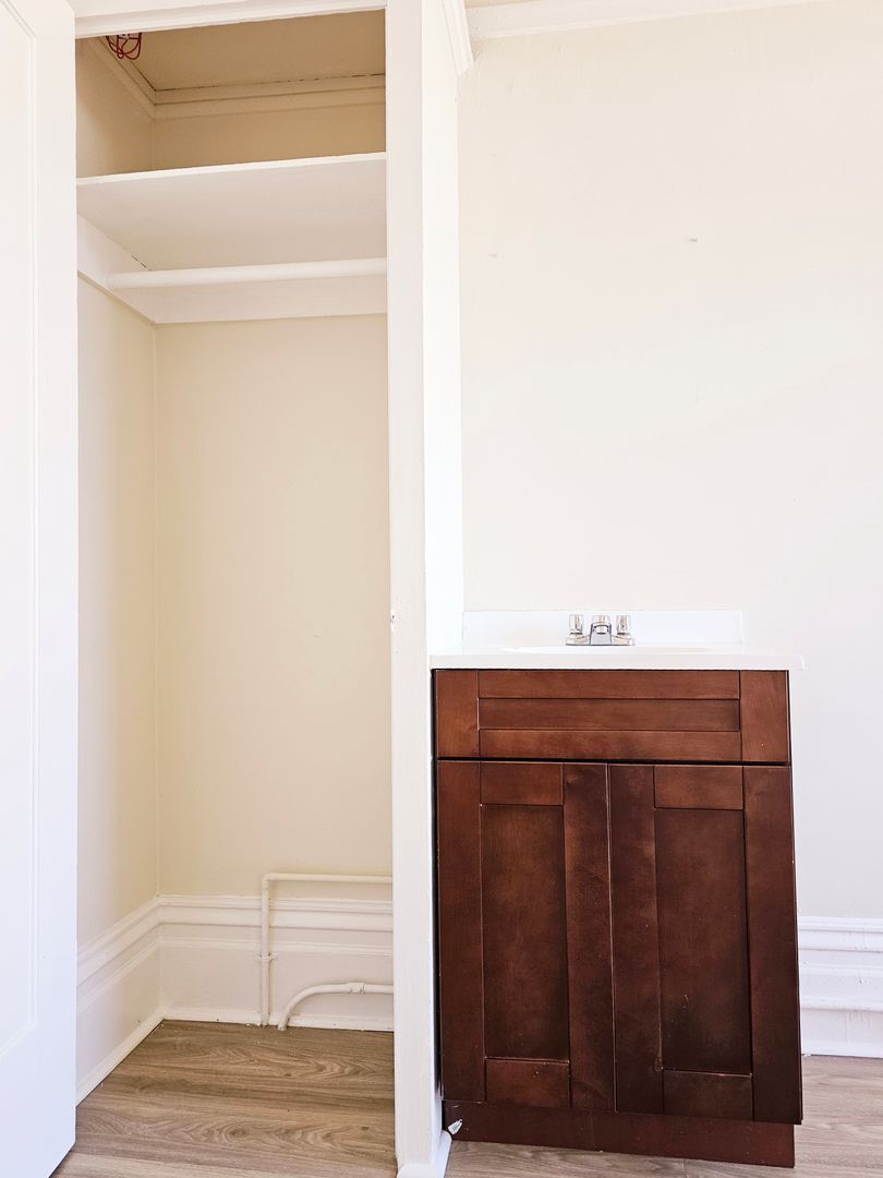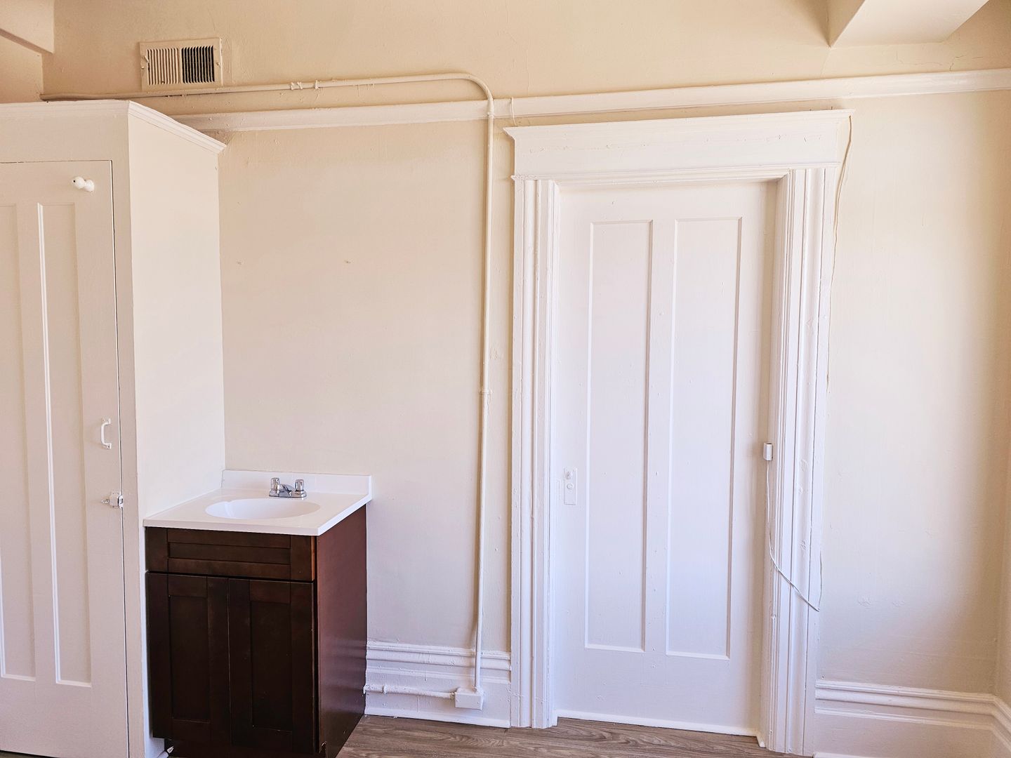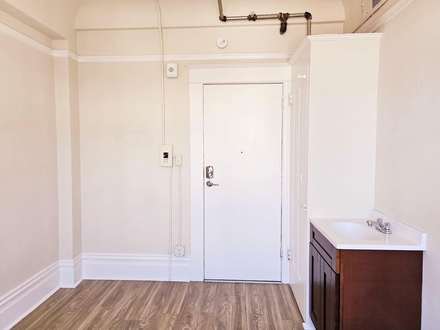 The modern design of this corner room has architecturally stunning walls. This top-floor corner room also includes new walnut color floors and a sleek in-unit, private sink and mirror—very convenient!