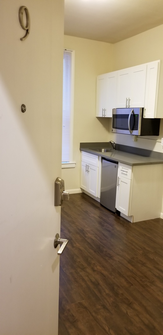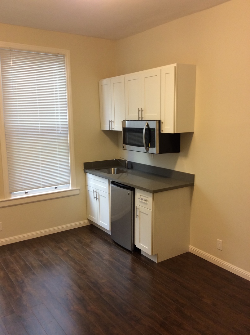 The unit features a modern, renovated kitchen, including stainless steel fixtures, and a mini refrigerator. Unit also comes with dark honey-colored hardwood flooring. Bathroom is conveniently located down the hall. The room is spacious and the perfect size for a student or professional who wants to experience the hustle and bustle of real San Francisco living.