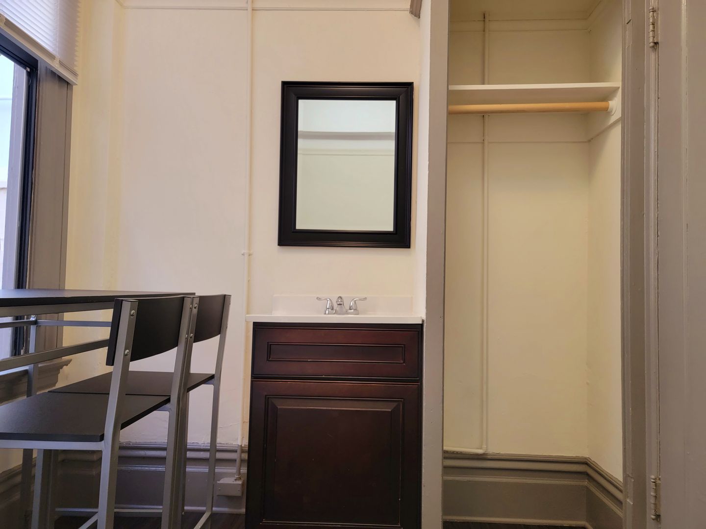 The modern design of the room including new charcoal color floors and a sleek in-unit, private sink and new mirror - very convenient! Shared bathroom is newly renovated! European tiling in modern shower and floor throughout. The building also has a communal kitchen and onsite washer/dryer.