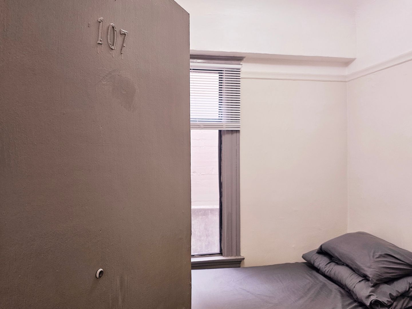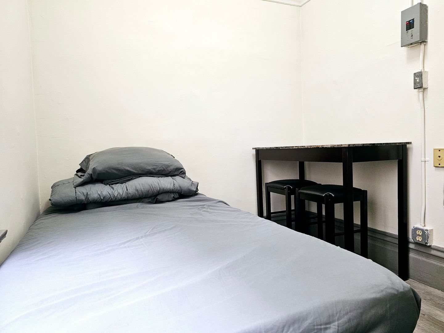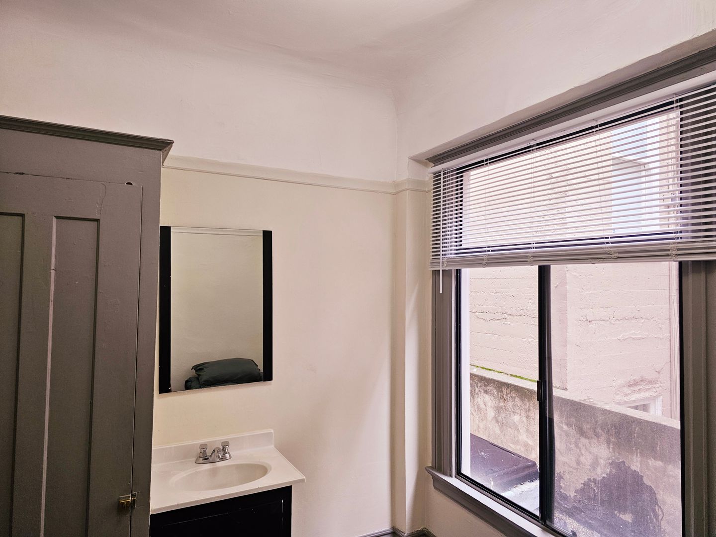 The modern design of this corner room has architecturally stunning walls. This room also includes new gray color floors and a sleek in-unit, private sink and mirror—very convenient!