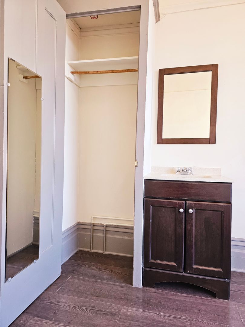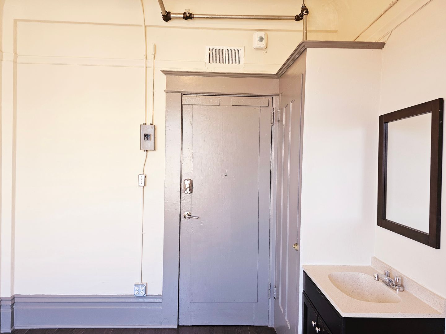 The modern design of the room including new charcoal color floors and a sleek in-unit, private sink and new mirror - very convenient! Shared bathroom is newly renovated! European tiling in modern shower and floor throughout.