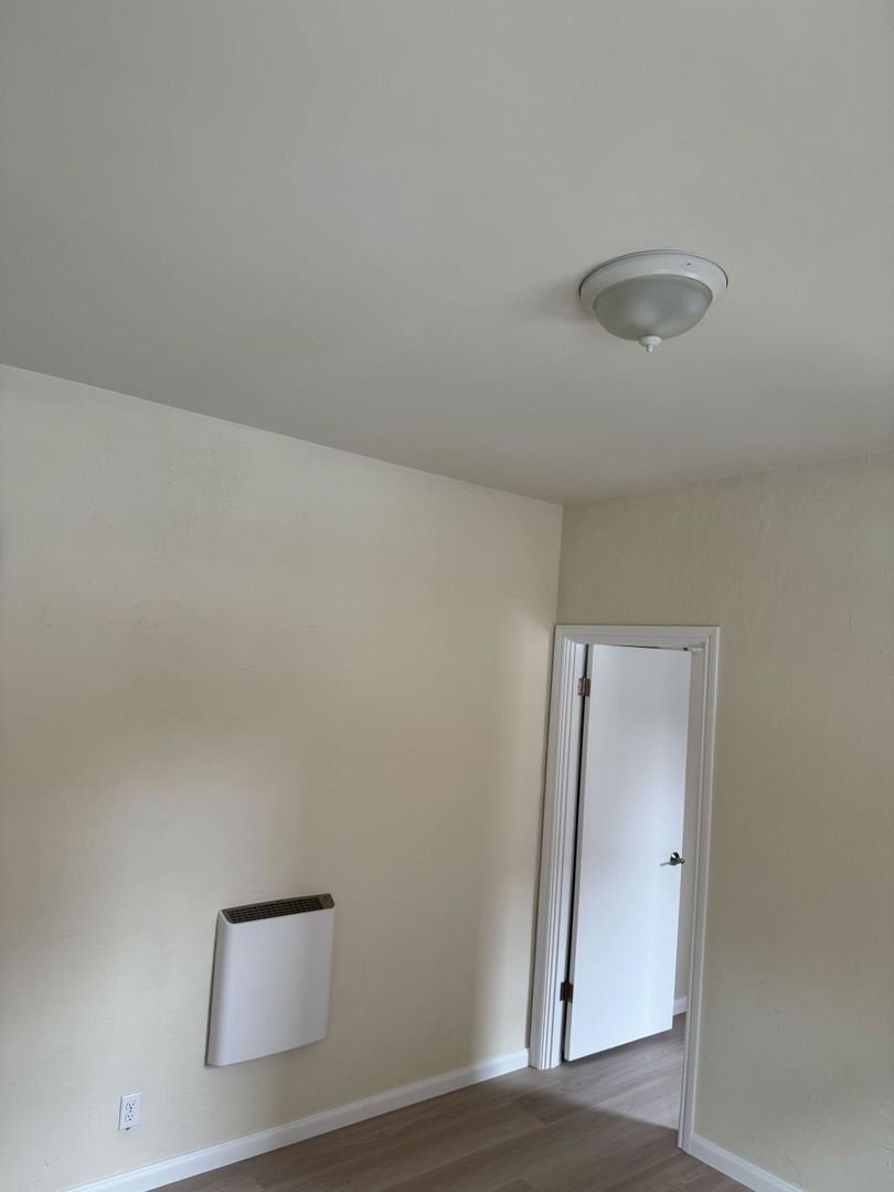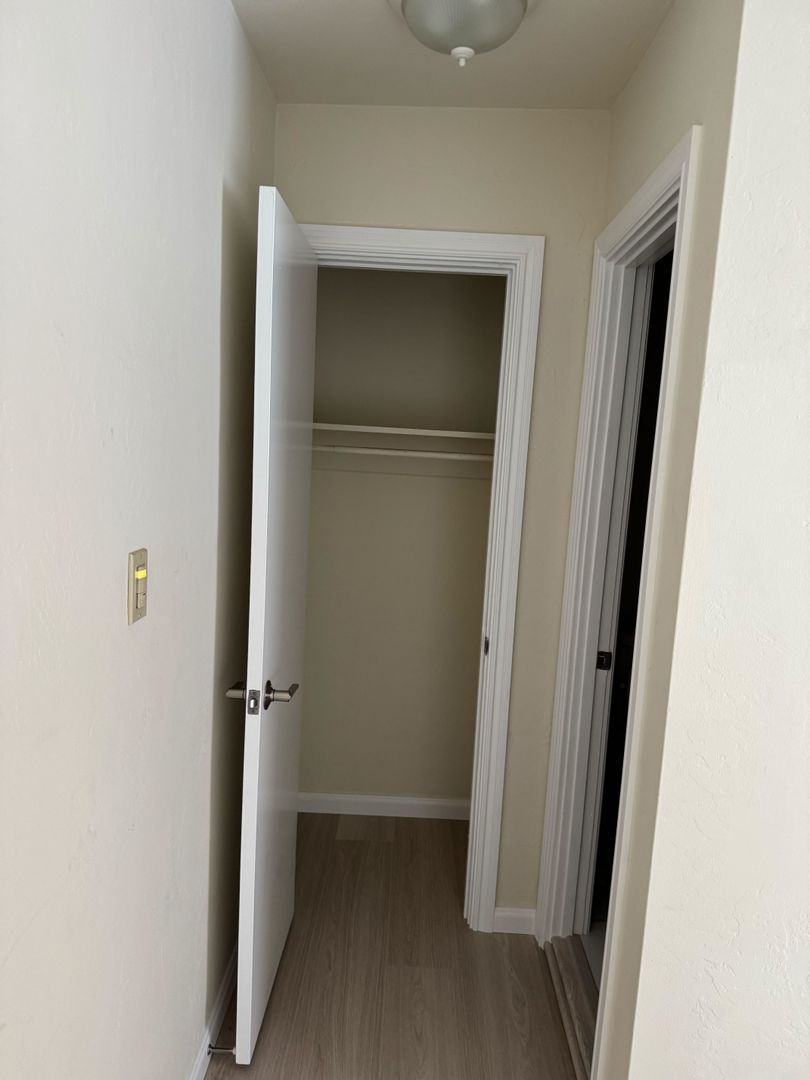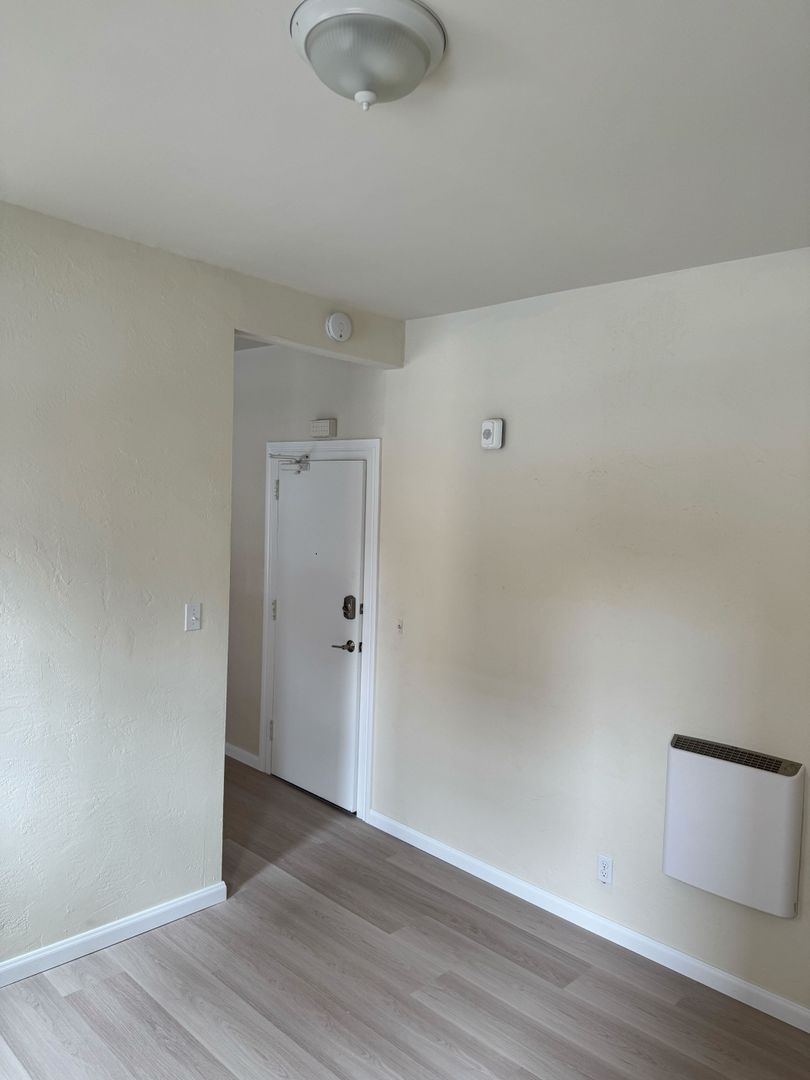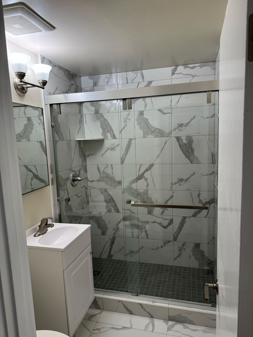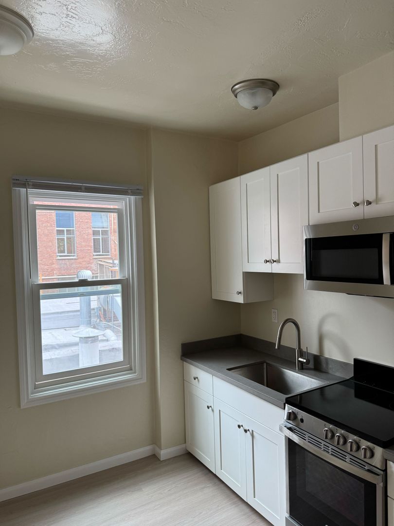 This one bedroom also includes modern floors and a sleek in-unit kitchen, private sink and mirror with white tiling in modern shower.