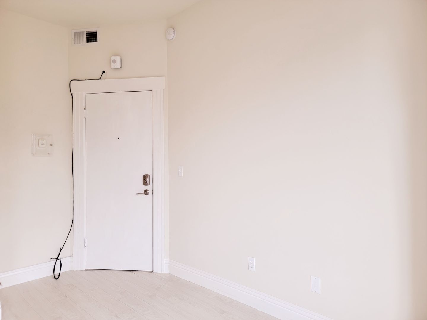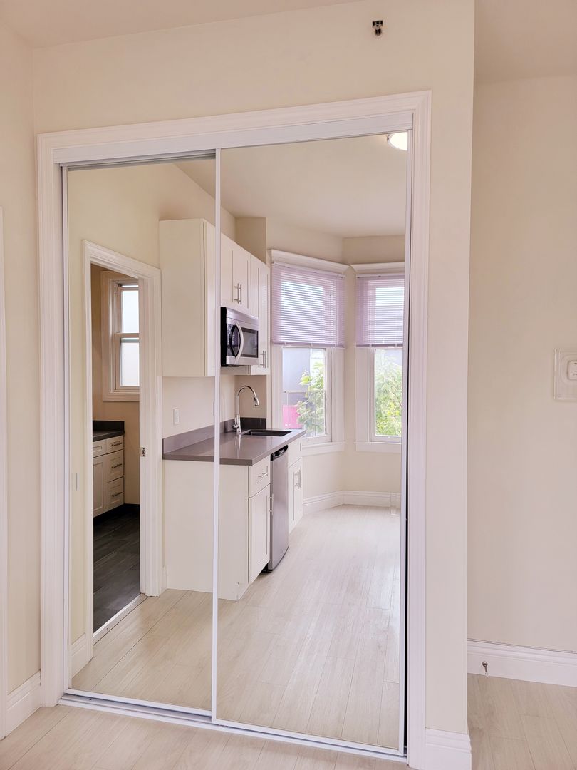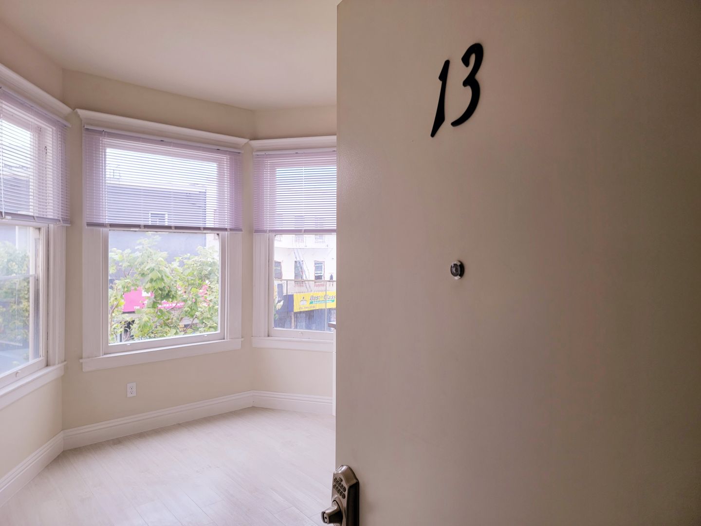 This bay window unit features light-colored hard surface flooring and a private kitchenette. Bathroom is conveniently located down the hall. The room is spacious with and is the perfect size for anyone who wants to experience the hustle and bustle of real San Francisco living.