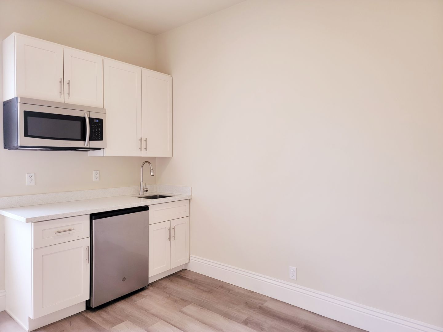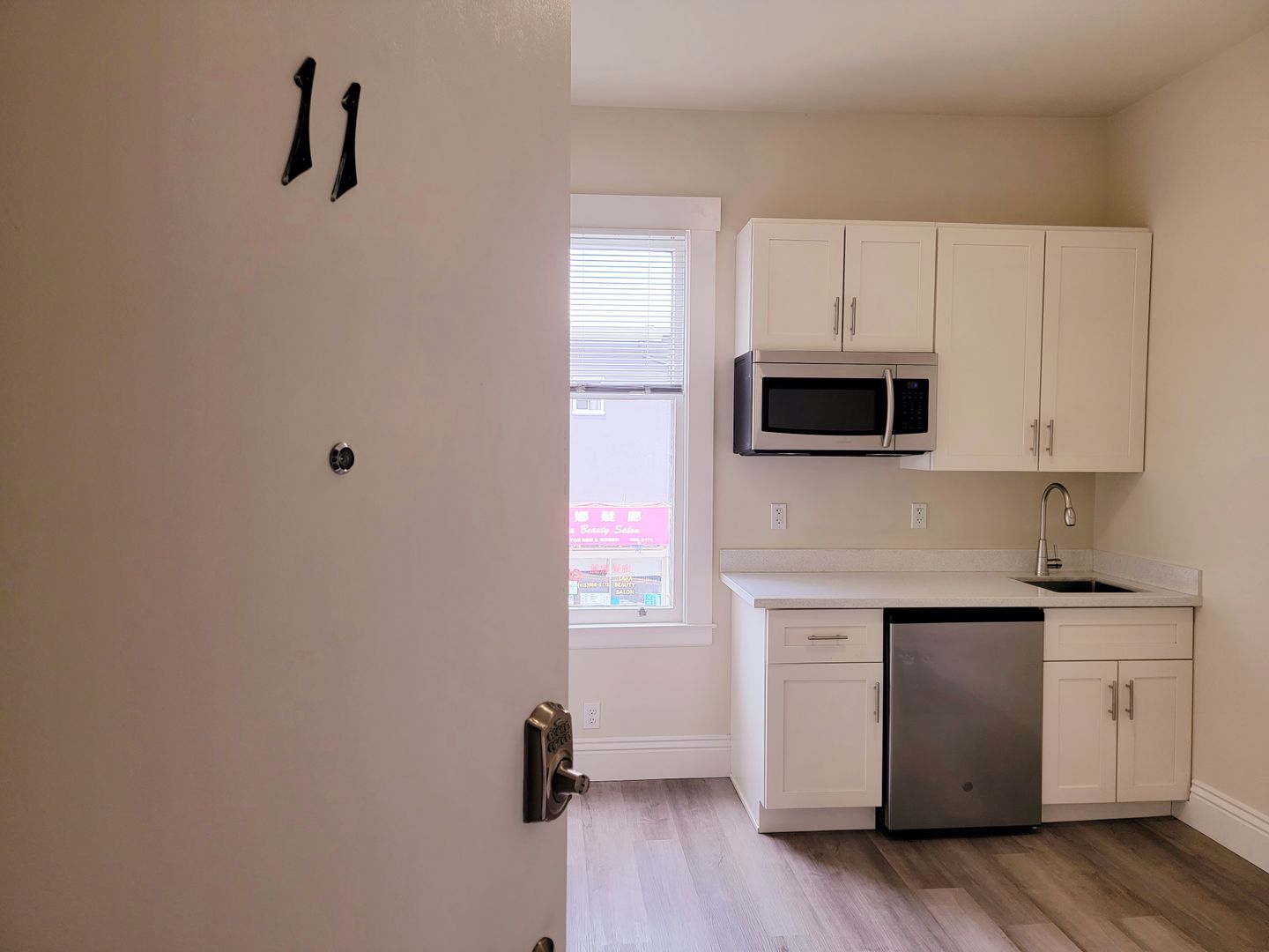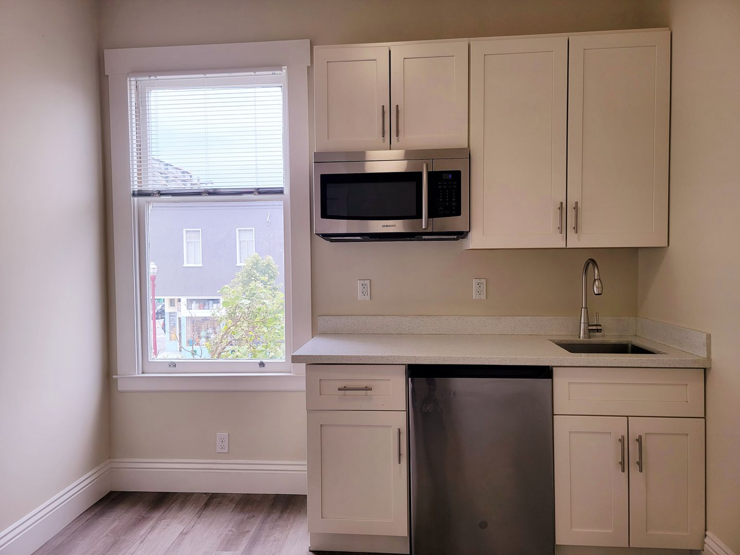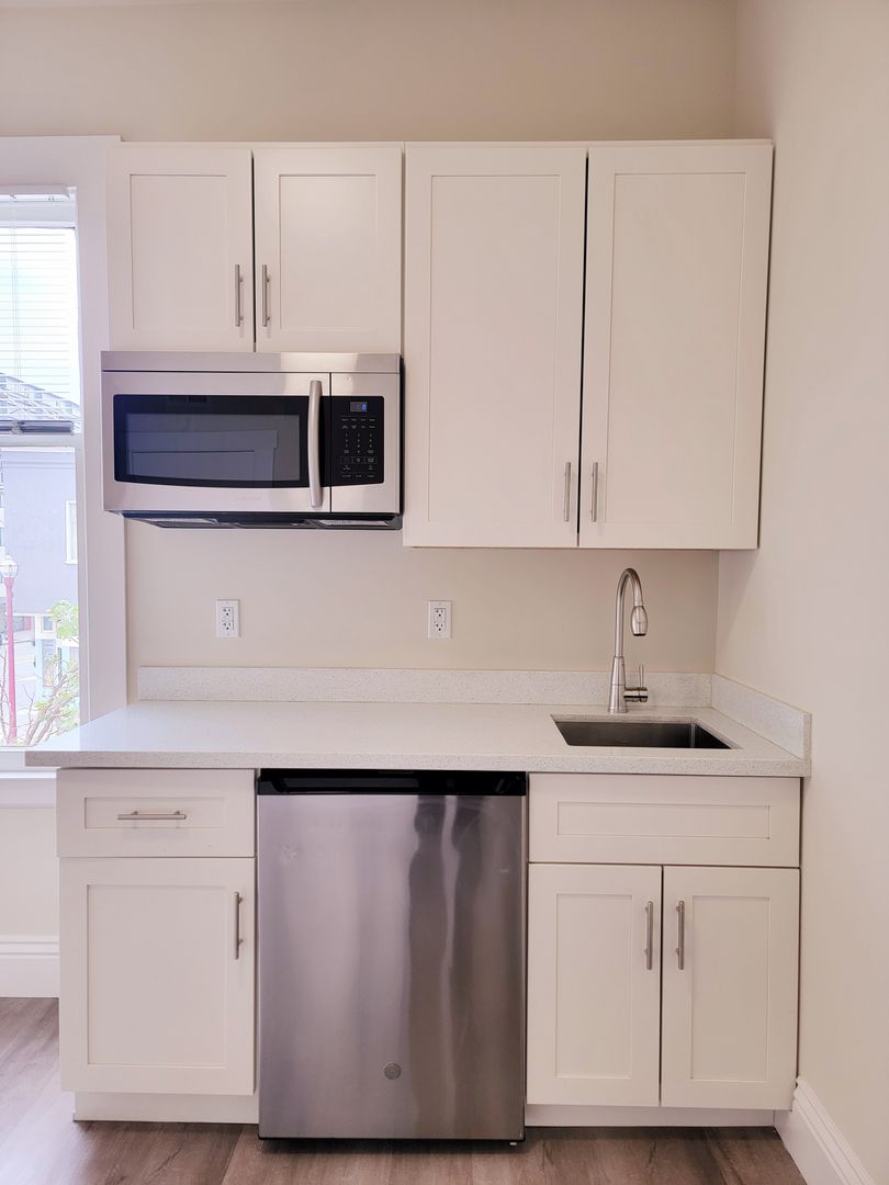This Top Floor unit features gray-colored hard surface flooring and a private kitchenette. Bathroom is conveniently located down the hall. The room is spacious with and is the perfect size for anyone who wants to experience the hustle and bustle of real San Francisco living.