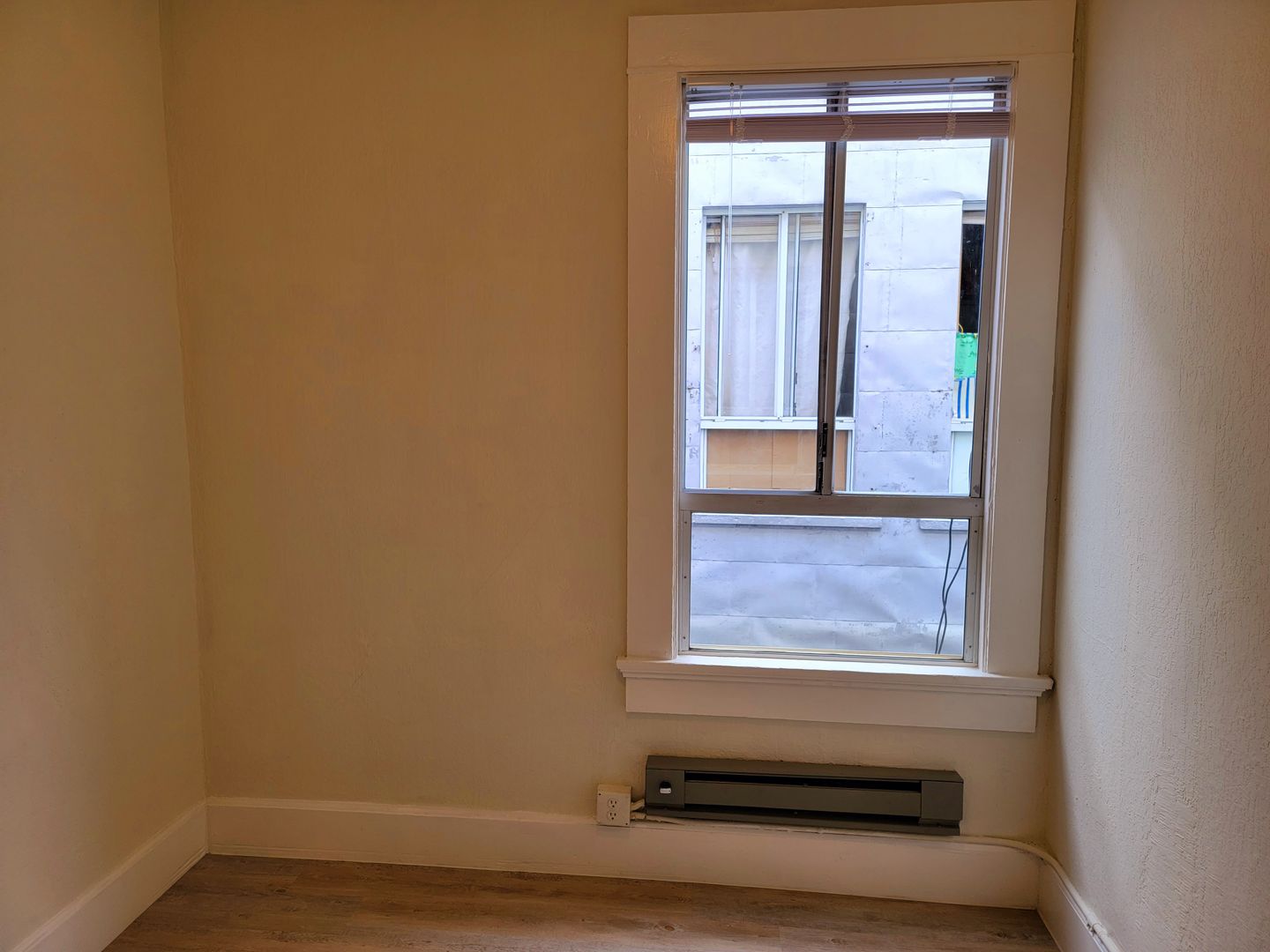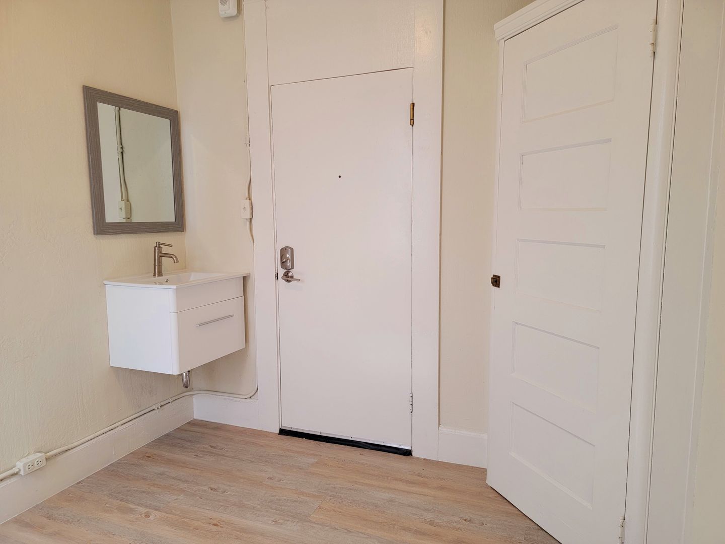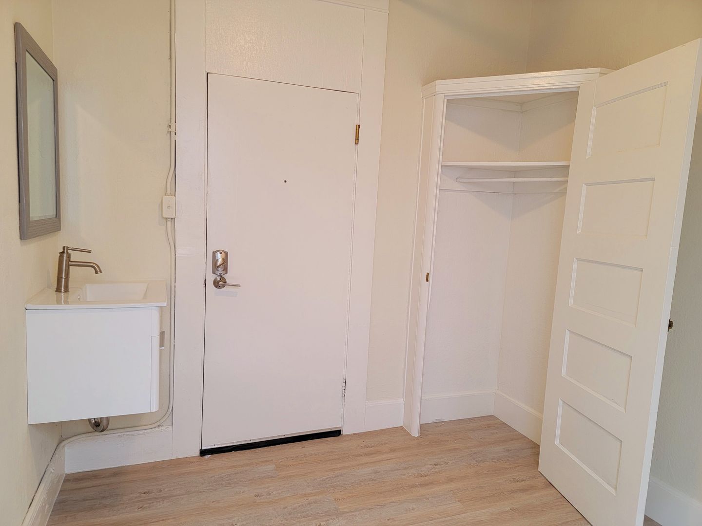 Unit comes with mahogany-colored flooring and in-unit sink/ vanity. Bathroom is conveniently located down the hall. The room is spacious and the perfect size for anyone who wants to experience the hustle and bustle of real San Francisco living.