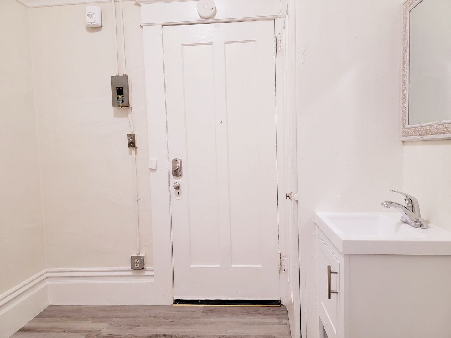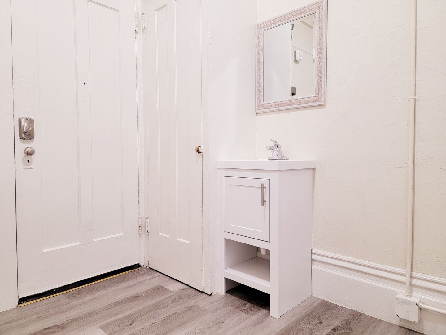 The modern design of the room including new charcoal color floors and a sleek in-unit, private sink and new mirror - very convenient!