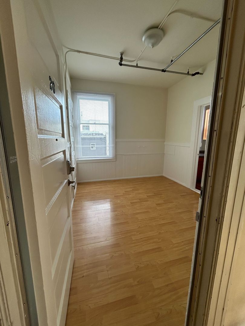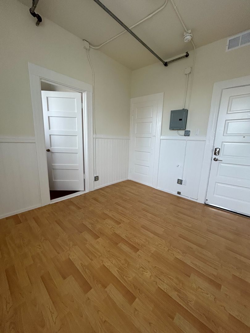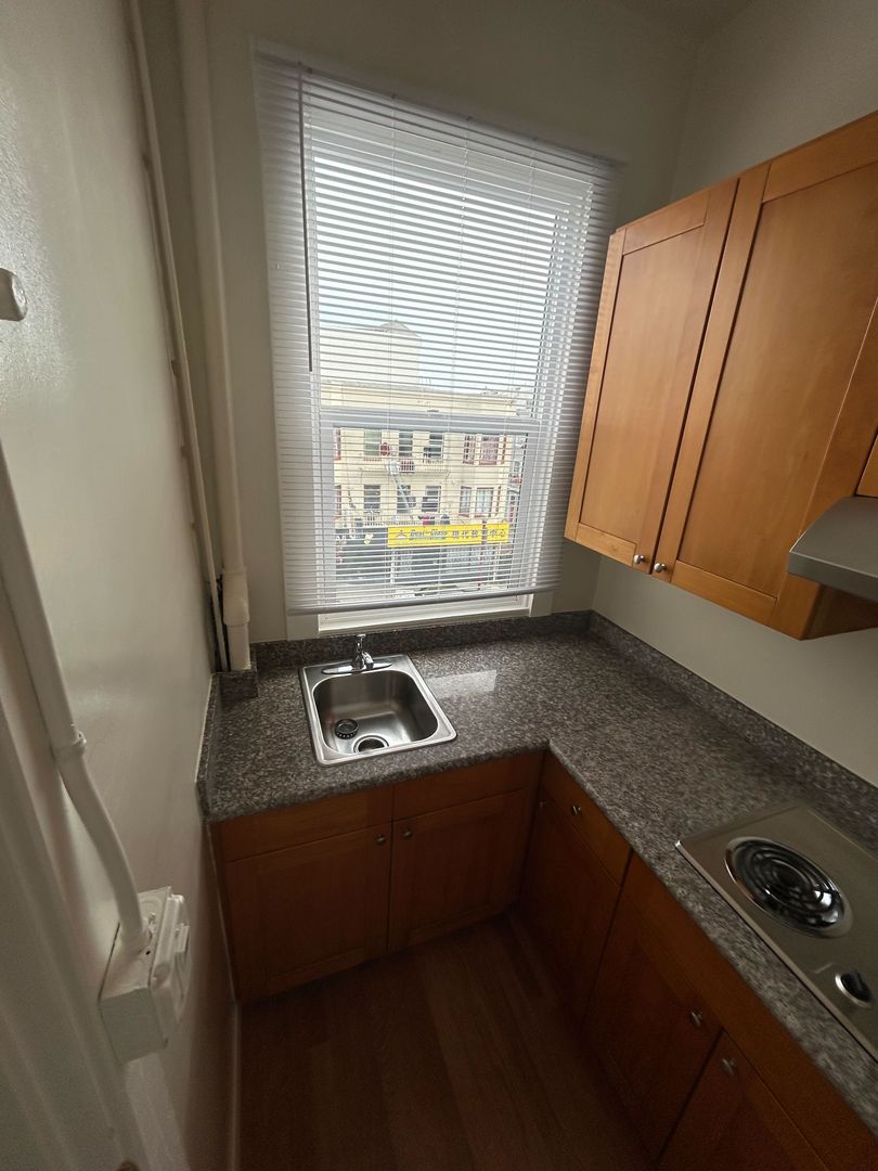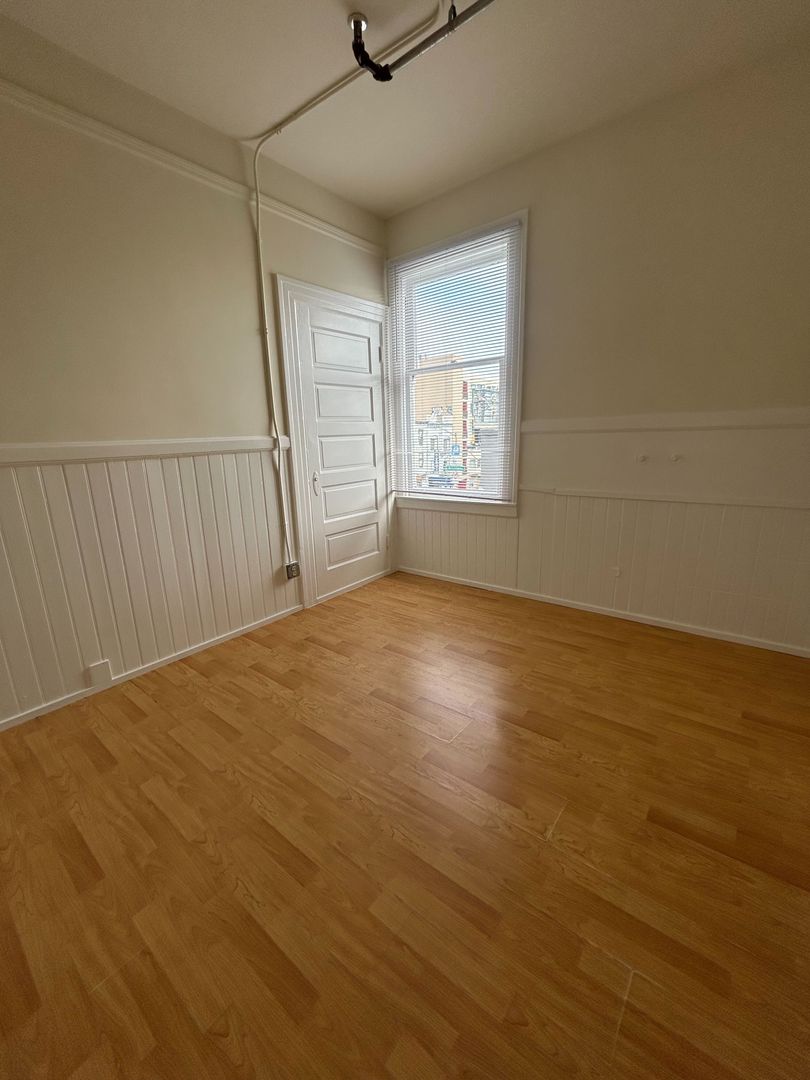 Unit features walnut-colored flooring. Bathroom is conveniently located down the hall. The room is spacious and the perfect size for anyone who wants to experience the hustle and bustle of real San Francisco living.