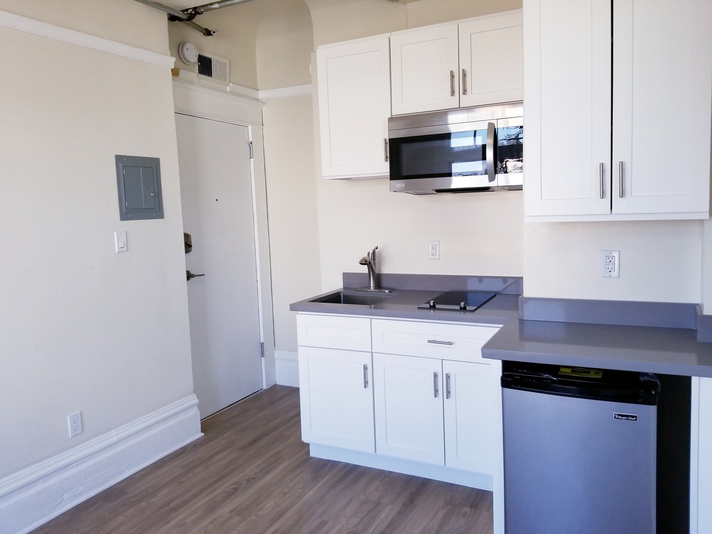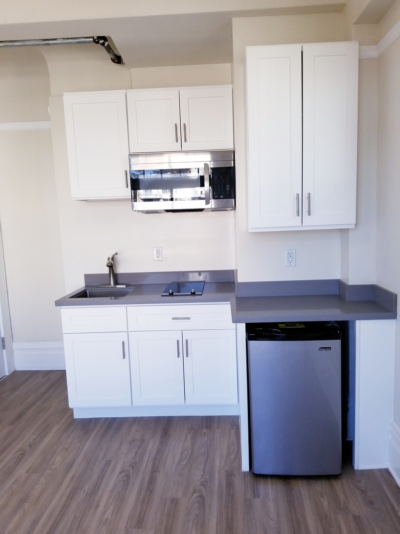 The newly renovated modern design of the room including new dark honey floors and a sleek in-unit, private kitchen - very convenient!